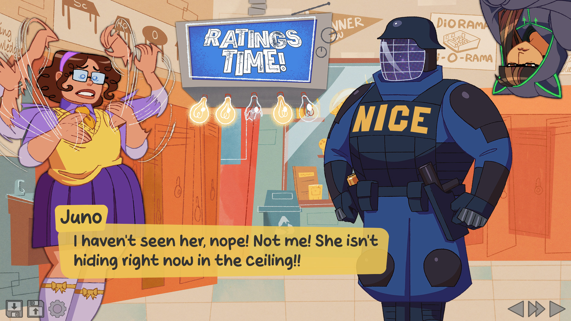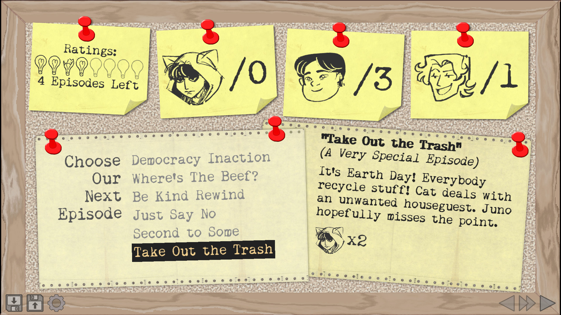 You're now the lead writer for Juno's World, a perfectly normal sitcom in which nothing strange or horrible happens, ever! Choose your scripts, decide what characters to build relationships with, and keep those audience ratings high -- or get cancelled in more ways than one! Welcome to Must See TV.